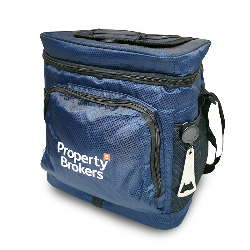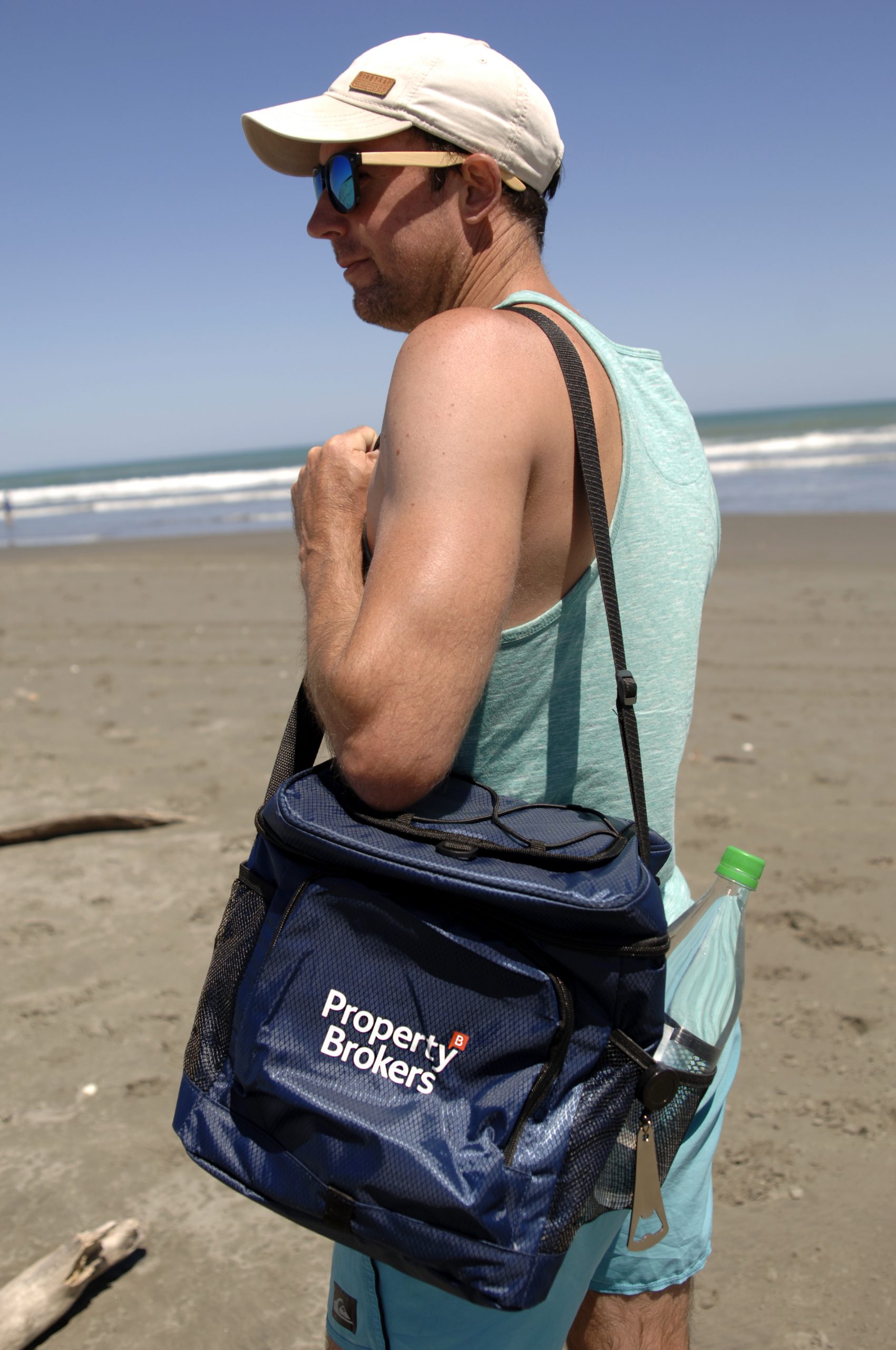 Max Beach Cooler bag with retractable bottle opener. Premium Diamond Ripstop 420D Polyster. Easy open velcro lid. Large front zip pocket. Side mesh pockets. 300w x 310h x 230d (24 litres).