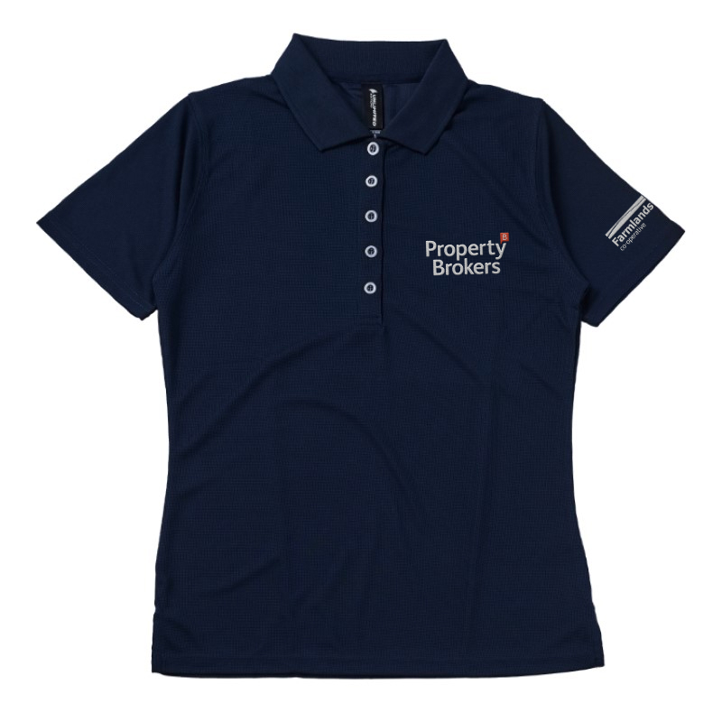 100% Polyster Quick-dry textured knit Executive polo with full colour Property Brokers branding on LH chest, Farmlands branding on the left hand sleeve. Proud to be here on the back. Plain rib collar with metal buttons and side splits at hem.